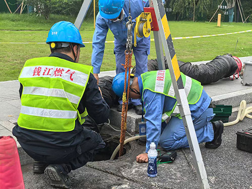 10点54分,路人报13号大街与22号大街交叉口附近闻到很浓的煤气味,钱江公司接警后迅速出动,于11:07抵达现场,快速查漏并锁定泄漏阀门井,同步开展警戒隔离、人员疏散和非机动车引导工作。抢修人员在做好现场安全和防护措施后下井细致查漏,精准锁定泄漏点;现场指挥部快速准确制定抢修处置方案,明确需关闭阀门和人员分工,并联系外部支援力量确保抢修迅速有力;其他人员及时做好信息沟通和后勤保障工作。在经过系列紧张有序、协同有效的应急处置后,修复完成、测漏合格并恢复供气,12:23应急拉练圆满结束。