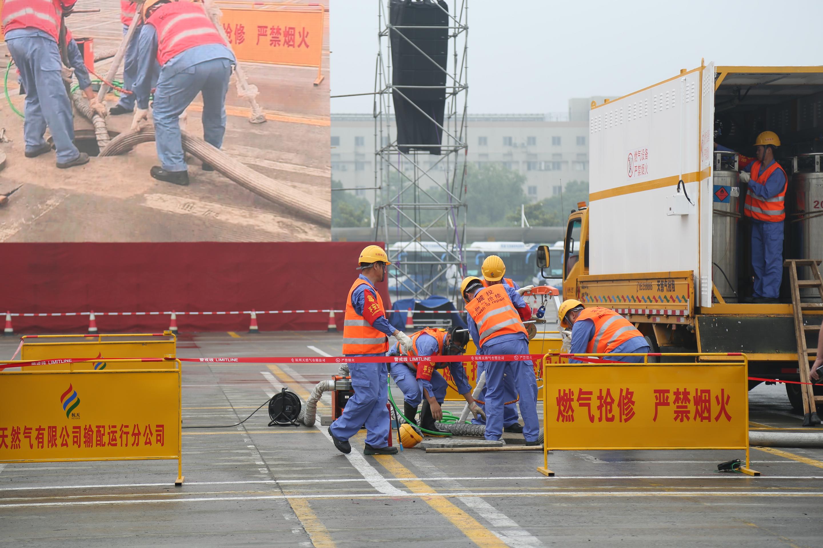 演习环节情节逼真、紧张有序,模拟的是重点保障区域内的一家非重点用户发生了液化气泄漏及燃爆,泄漏的液化气集聚在下水井内,因燃爆导致下水井附近的天然气阀门井内膨胀节发生变形。为了保障该天然气管道供应的重点场所及用户安全稳定不间断用气,在修复膨胀节的过程中,通过应急气源撬对用户临时供气。早在4月份,燃气集团即开始了应急演练的筹备工作,演练团队充分发挥“工匠精神”,逐字推敲演练脚本,精准定位演练动作,通过30余次的不断演练和反复修改,使得演练既逼近真实,又具有较高的现场观赏价值。此次演练不仅脚本上臻于至善,还体现了内部4家参演单位间的紧密配合、外部消防的完美对接,更是贴近主题,体现在峰会保障期间对重点用户安全稳定供应的应急处置与响应的完美检验。