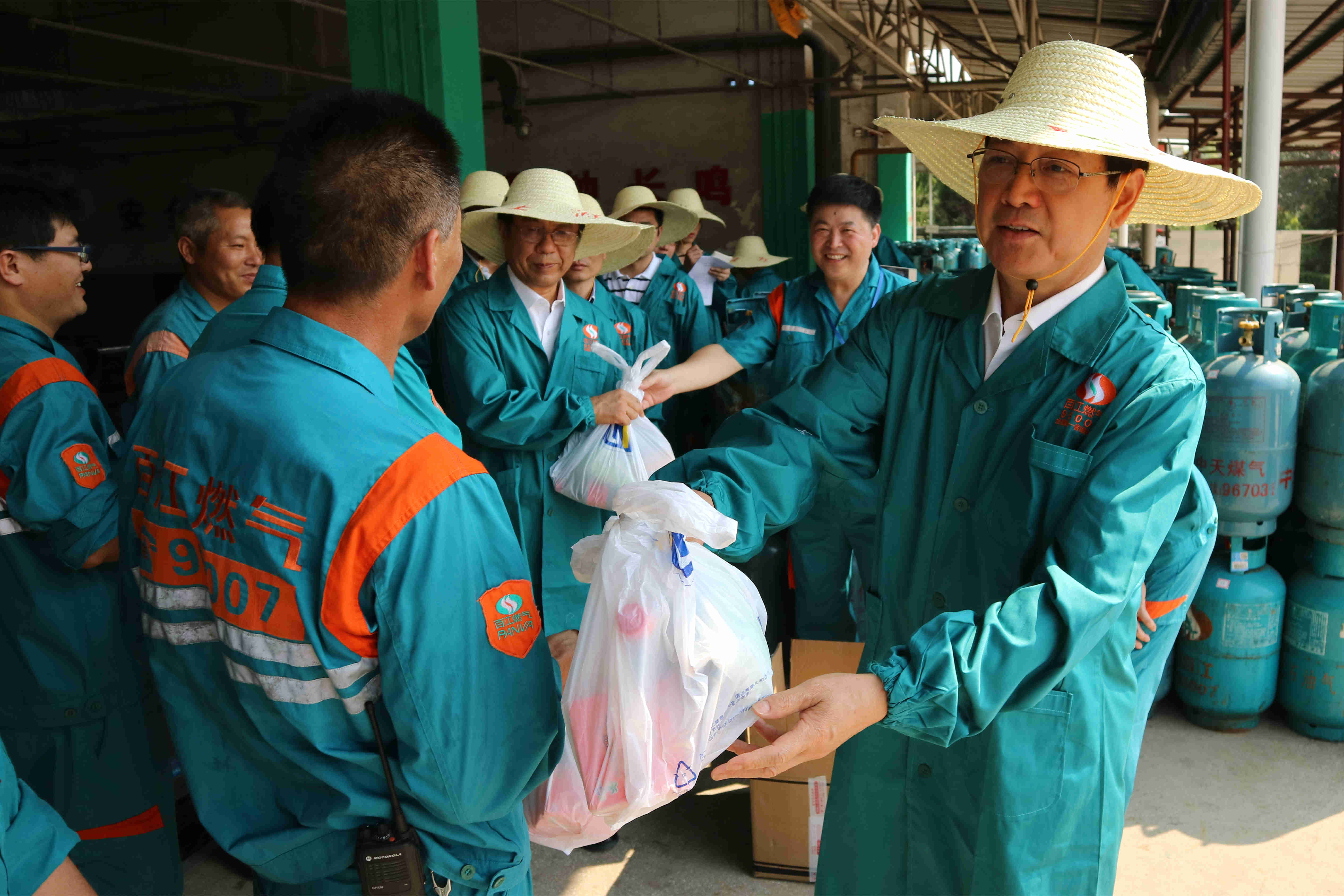 孙主席一行在实地查看了生产作业区储罐储液、瓶装液化气充装检验等现场作业,并仔细询问钢瓶充装管理、报废管理情况后,充分肯定杭燃百江公司的安全生产投入及阶段性成效。结合杭州市液化气行业的市场现状,指出,杭燃百江公司要继续将“安全”二字认真贯彻到生产销售全过程,严格废弃钢瓶的回收管理,绝不让废弃钢瓶回流市场。同时,孙主席要求有关部门严厉打击市场上无证经营“黑气点”,维护公共安全,共同建设一个安全、和谐的液化气市场。随后,孙主席一行与杭燃百江公司一线工作人员一一握手,送上高温慰问品,感谢他们在持续高温天气下坚守岗位,为杭州市民的正常生活提供保障。