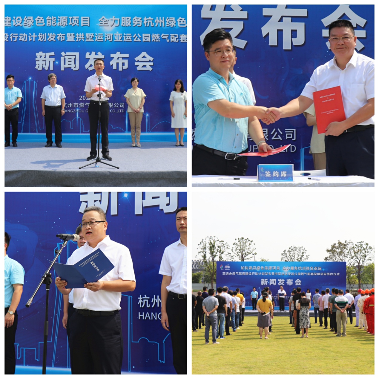 9月9日,是2022杭州亚运会倒计时两周年之际,集团组织召开“加快建设绿色能源项目 全力服务杭州绿色亚运——亚运会燃气配套建设行动计划发布暨拱墅运河亚运公园燃气配套保障项目签约仪式”新闻发布会。杭州亚组委场馆建设部副部长陆春江、副处长李沈飞、片组负责人胡黄蔚,市建委地空管线处副处长陈莉钧,市城投集团工程建设部部长金兴平,拱墅运河亚运公园项目副总指挥韩国利,蓝城杭亚文体发展有限公司总经理刘宓,燃气集团党委副书记、副总经理朱琴君,副总经理王忠平、俞峻,杭天公司副总经理刘元清等领导嘉宾出席,11家省市媒体现场报道。