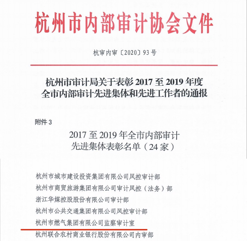 近日,电竞博彩网 获得杭州市审计局颁发的杭州市2017-2019年内部审计先进集体和内部审计先进工作者荣誉。这是继获得浙江省2019年度“内部审计结果运用”典型经验评比三等奖、杭州市2019年度“内部审计结果运用”成果评比一等奖的基础上再次获奖,这些荣誉是上级审计部门对集团公司内审工作的充分肯定。