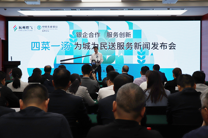 党委书记、董事长芦俊为发布会致辞:“四菜一汤”是全国燃气行业内首创的由杭州市公用企业和农行杭州分行通过企银合作、产融结合打造的首款终端用户系统服务产品,不仅打通了产品服务的服务送达、交易支付两大基础通道,更实现了杭燃服务从报装服务、代建服务、延伸服务走向增值服务的新提升,是电竞博彩网