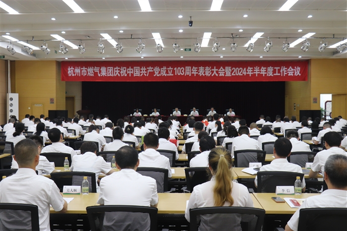 2024年7月12日下午,电竞博彩网 召开庆祝中国共产党成立103周年表彰大会暨2024年半年度工作会议。集团领导万向伟、俞峻、周勤芳、徐小冬、赵伟儿、严益剑,全体中层干部,各单位基层干部正职(副职主持工作),浙江工匠、浙江建设工匠,职工董监事、工会委员、团委委员,在职劳模、五一劳动奖章获得者,“杭燃先锋连”副排级以上人员,硕士学历及高级职称员工共计180余人参加会议。会议由集团党委委员、纪委书记赵伟儿主持。