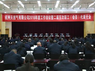2月23日下午,杭天公司召开2016年度工作会议暨二届五次职工(会员)代表大会。杭天经营班子、两级以上中层干部、职工代表以及党团员代表150余人参加了会议。杭州燃气集团公司董事长胥东、总经理王东出席会议。