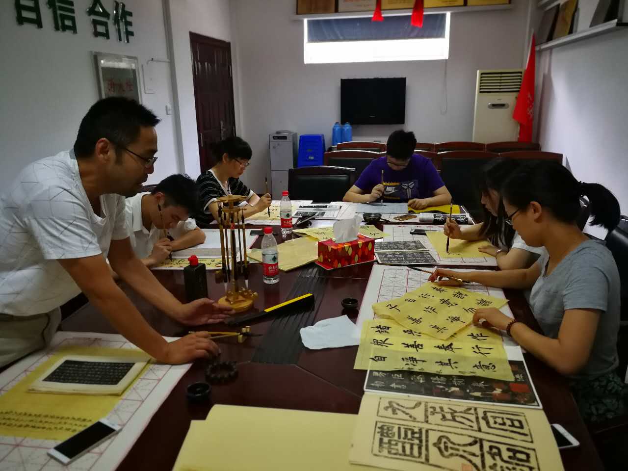 自活动室成立以来,感兴趣的员工积极投入到练习毛笔字的热潮中。中午时分,会议室便墨香浓郁,座无虚席,成为了员工午休时间的好去处,修身养性的好场所。分公司也充分利用“自有资源”,邀请不仅在工作上经验丰富,更是精通书法、绘画、古筝的建设发展科施工员吴俊良作为老师开展现场指导。吴老师在指导学员们毛笔字书写姿势、执笔方法、笔画、毛顺的同时,还分享临摹拓本字体的区别、来源等知识,充分担当了中华传统文化的传播者。