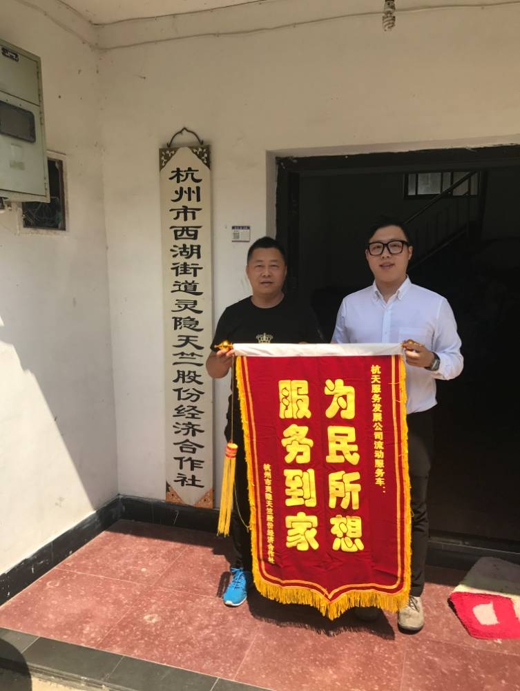 9月5日,杭州市西湖街道灵隐天竺路社区的领导将写有“为民所想,服务到家”的锦旗送到杭天公司流动服务车工作人员手中,赞扬公司急百姓所需,解百姓所求,并感谢“和谐号”流动服务车为天竺路社区居民提供便捷的上门服务。