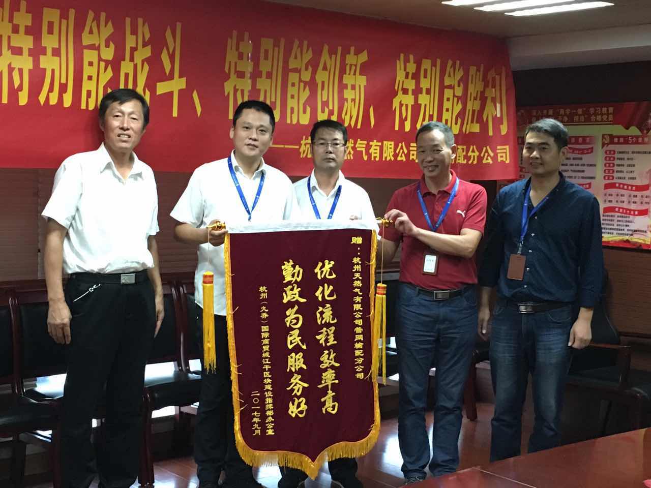 9月28日上午,杭州(九乔)国际商贸城江干区块建设指挥部办公室送来一面写有“优化流程效率高 勤政为民服务好”的锦旗,对杭天公司热情高效的服务、施工人员认真负责的工作态度给予了高度的赞扬并表示由衷的感谢。