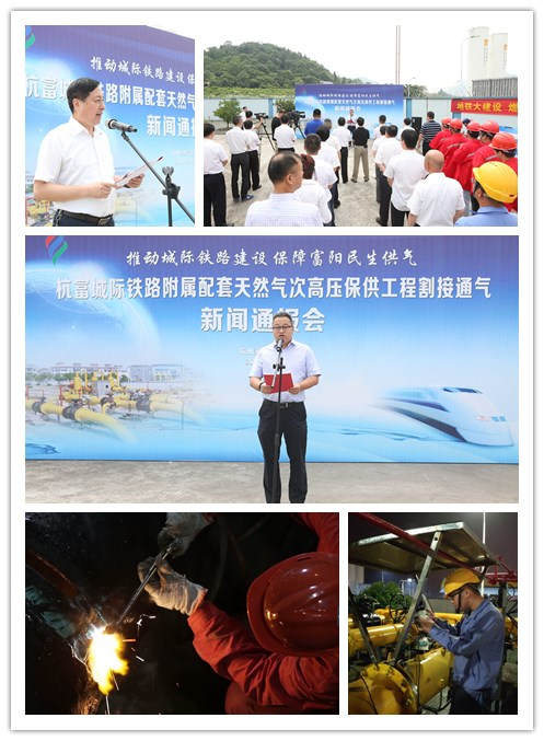 6月12日上午,杭天公司在富阳高中压调压站内召开“杭富城际铁路附属配套工程杭州至富阳天然气次高压保供管道割接通气”新闻通报会。市轨道办工程保障处副处长陈新、杭州市地铁集团工程一部部长肖怀全、杭州市燃气集团副总经理王忠平、富阳华润天然气有限公司副总经理赵冠华应邀出席。杭天公司经营班子、电竞博彩网 建设发展部、综合管理部及杭天公司相关职能部室及下属各分公司负责人,杭富线次高压保供工程设计、建设、监理单位共30余人参加。浙江公共新闻频道、杭州1台、杭州2台、杭州日报、钱江晚报、都市快报、杭州网、杭州出版社等省市新闻媒体现场报道。电竞博彩网 总经理助理、杭天公司副总经理俞峻作新闻发布,杭天公司党委副书记陆伟祥主持。