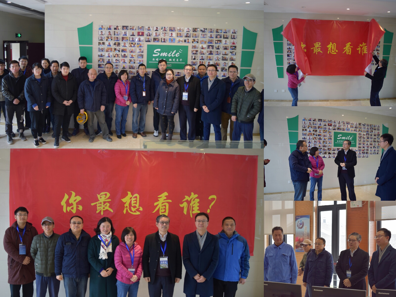 俞磊一行来到东部站一楼大厅,一幅印有“你最想看谁”的红幕首先映入眼帘,分公司经理胡裕民介绍:这是分公司新制作完成的主题为“激情燃烧,微笑万千”的微笑墙,汇集了分公司每位员工工作时展示的微笑。全体员工踊跃参与微笑墙的制作,把自己最美好的微笑展现出来。俞磊、赵伟儿共同为微笑墙揭幕,并与分公司职工代表一起在微笑墙前合影留念。