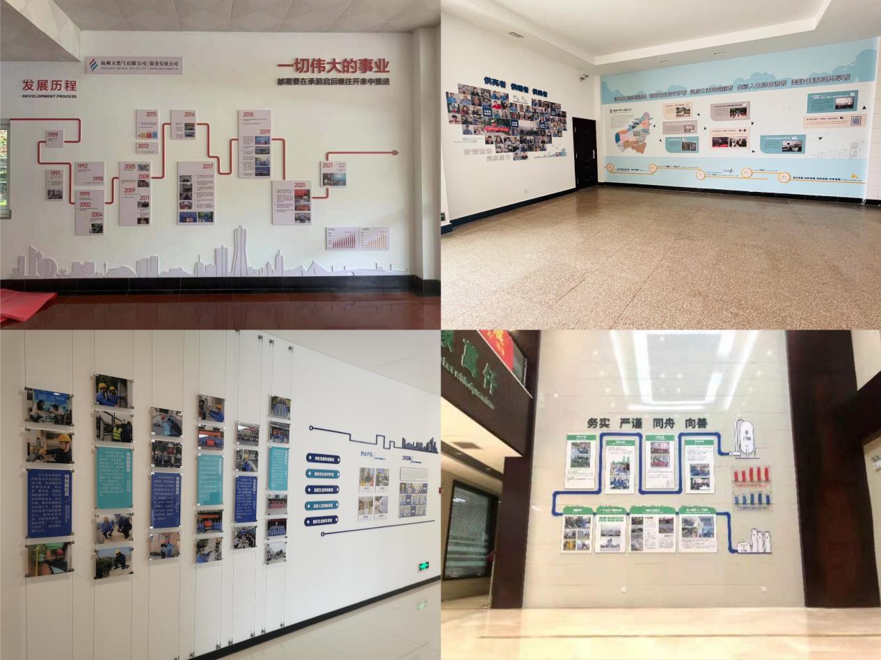 杭天服务发展公司文化墙设立在北大桥办公楼一楼,由发展历程和杭服人物两块内容组成,生动展示服务发展公司的“前世今生”及发展过程中涌现出来的诸多优秀的杭燃人。管网输配分公司文化墙直观展现分公司“六个特别”精神,展现分公司劳模工匠精神、企业历程、管网规模、组织架构和未来展望,并与一楼已经建成的大师工作室、一站式服务基地相呼应,全方位展示分公司的特色、亮点。高压储配分公司文化墙设置在东部LNG应急气源站,分左右两块墙面,左侧文化墙上部展示“杭州市域高压管网布局图”,右侧文化墙围绕分公司“四个之家”打造、四大产业经典案例等内容,将各专业线工作融入其中;滨江分公司“一墙”设于滨文路一楼大厅,整体定位国际滨,通过旅游导览图模式,讲述滨江大地上的燃气故事,同时结合全体员工笑脸融合团队墙,寓意企业如家的温暖。
