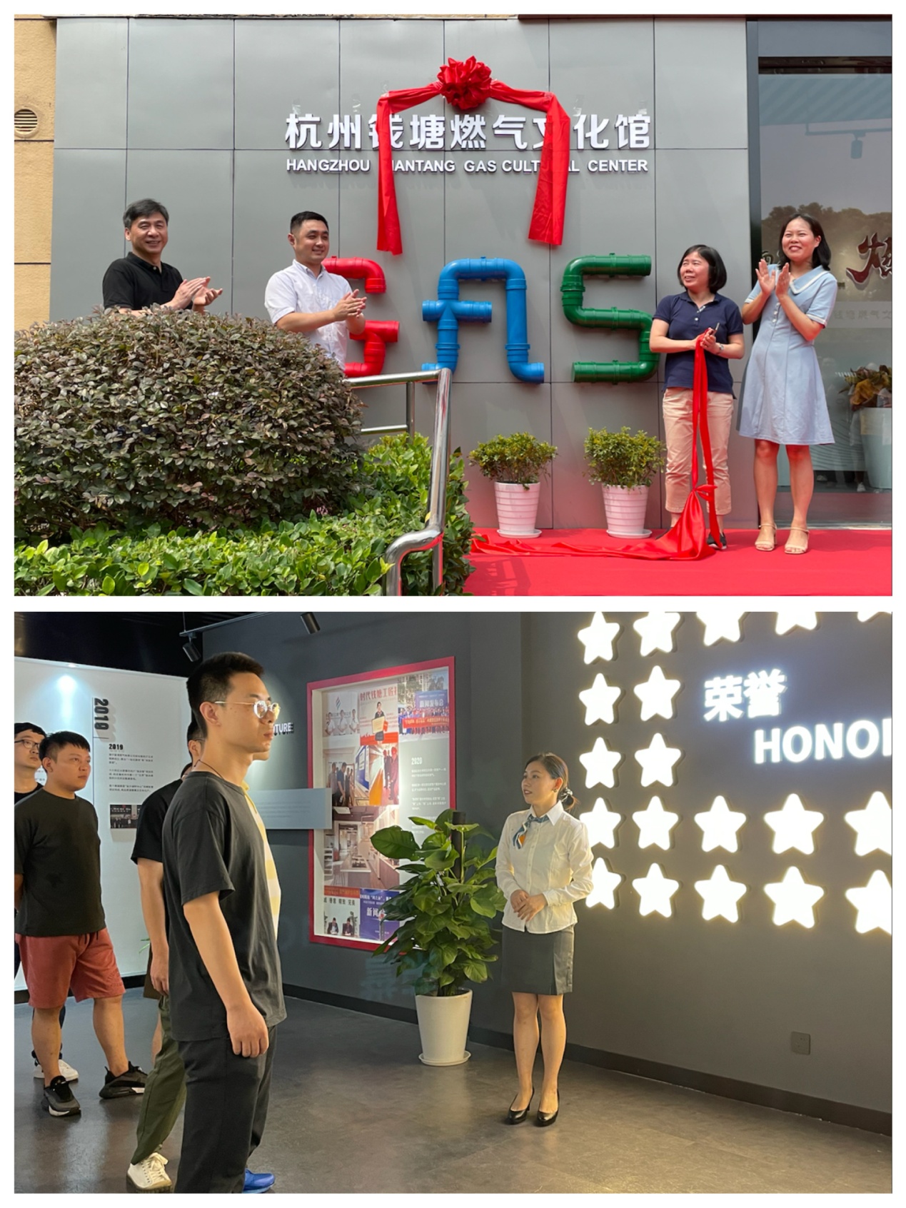 8月26日上午,钱江公司举行杭州钱塘燃气文化馆开馆仪式,电竞博彩网 党委委员、纪委书记赵伟儿、钱江公司总经理苏忠杰、副总经理俞勤峰、何香共同揭牌,各部门负责人、职工代表齐聚揭牌仪式现场,共同见证这一激动人心的时刻。杭州一台、杭州二台、杭州日报、钱江晚报、杭州网、钱塘新区报应邀参加。揭牌仪式结束,公司技能大师领衔人殷一珍带领媒体朋友及新员工进行参观。