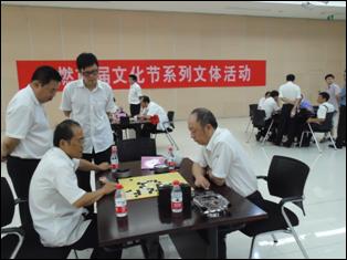 首届文化节围棋、象棋大赛在七堡基地多功能厅点燃战火!来自集团公司各单位的18名围棋高手和27名象棋爱好者参加比赛。集团公司俞建国总经理亲率机关代表队和棋友们同台对弈。集团公司党委副书记、工会主席王进忠等领导全程观战。