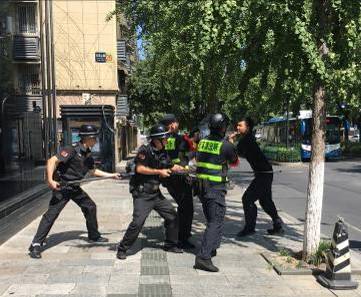 8月19日14时,在燃气大厦大厅南门突发惊险一幕,1名手持凶器的“歹徒”突然吼叫着冲入大厅企图实施恐怖破坏,大厦执勤保安和附近巡逻协警果断出击、迅速生擒控制“歹徒”。原来,这是西溪派出所在燃气大厦开展的一次反恐防暴突击演练。