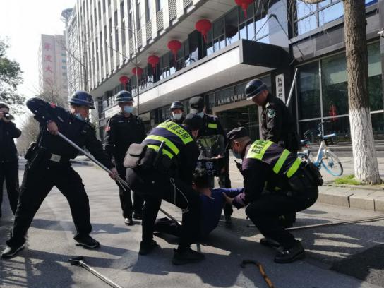 3月2日14:40分,燃气大厦一楼大厅门前,1名手持长棍的可疑男子企图进入大厅,执勤保安上前询问、并要求测体温和身份登记。该男子突然拔出“凶器”企图强闯。值勤保安立即利用身边的盾牌、钢叉与“不法分子”周旋对峙,分公司应急预案随即启动,物管部主任沈梁华、安全管理员王亮等闻讯立即赶到大厅……在大厦增援保安、西溪派出所110巡逻民警共同努力下,最终成功将“暴徒”制服。