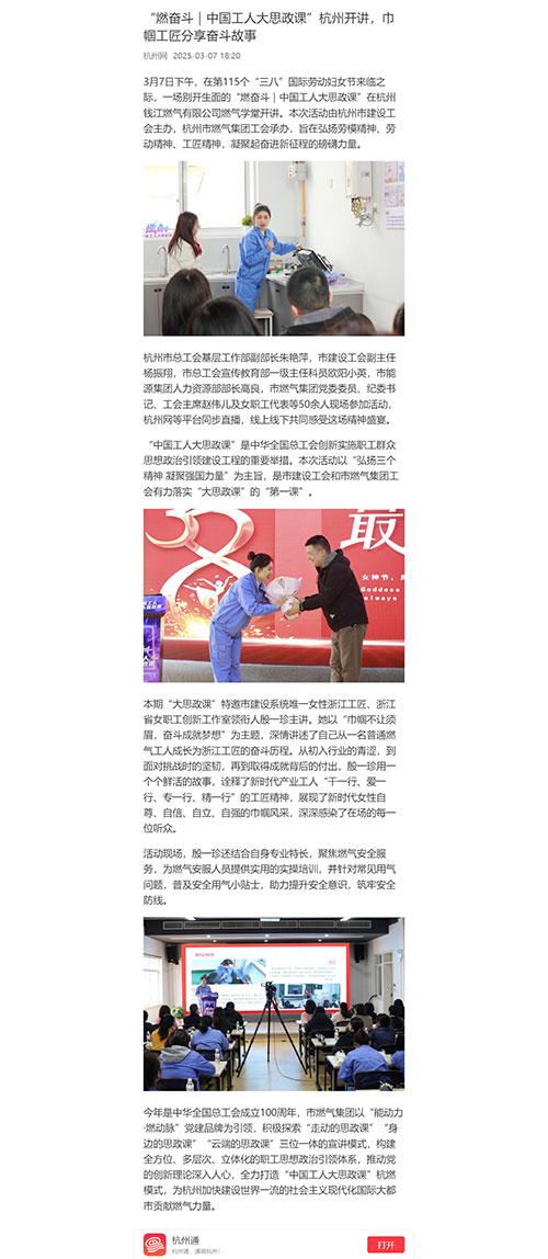 3月7日下午,在第115个“三八”国际劳动妇女节来临之际,一场别开生面的“燃奋斗|中国工人大思政课”在杭州钱江燃气有限公司燃气学堂开讲。本次活动由杭州市建设工会主办,杭州市燃气集团工会承办,旨在弘扬劳模精神、劳动精神、工匠精神,凝聚起奋进新征程的磅礴力量。
