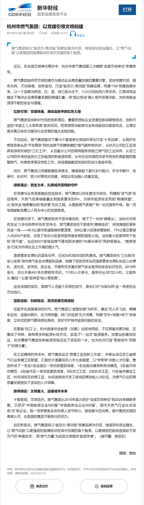 近日,在全国文明单位复评中,杭州市燃气集团第三次蝉联“全国文明单位”荣誉称号。