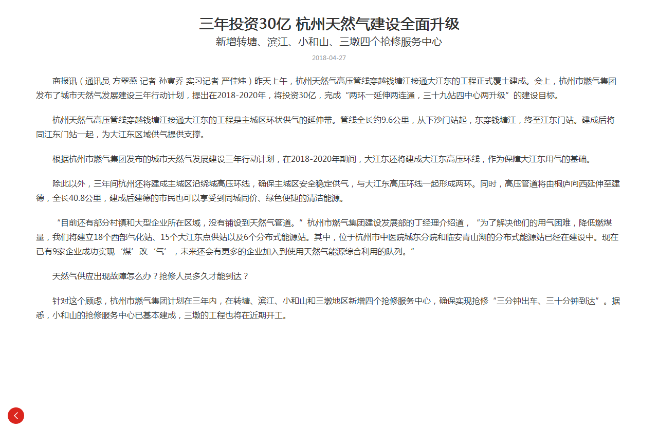 针对这个顾虑,杭州市燃气集团计划在三年内,在转塘、滨江、小和山和三墩地区新增四个抢修服务中心,确保实现抢修“三分钟出车、三十分钟到达”。据悉,小和山的抢修服务中心已基本建成,三墩的工程也将在近期开工。
