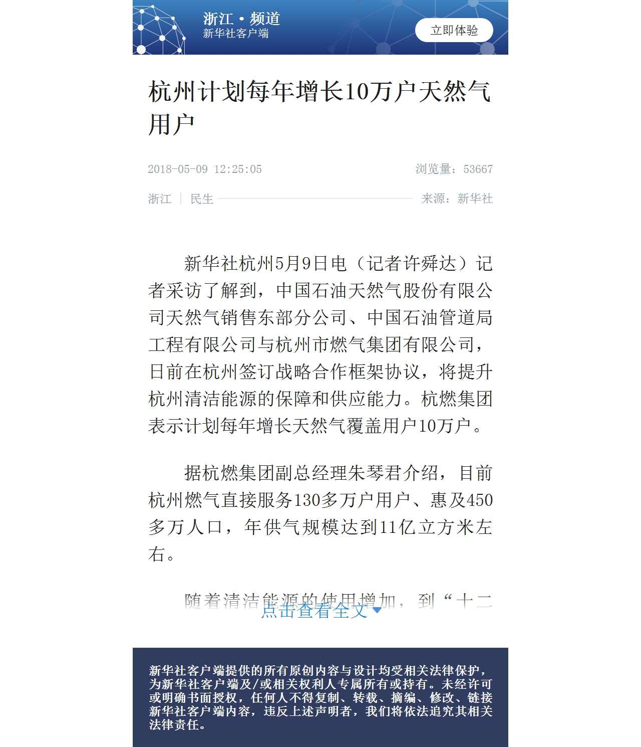 新华社杭州5月9日电(记者许舜达)记者采访了解到,中国石油天然气股份有限公司天然气销售东部分公司、中国石油管道局工程有限公司与电竞博彩网 ,日前在杭州签订战略合作框架协议,将提升杭州清洁能源的保障和供应能力。电竞博彩网 表示计划每年增长天然气覆盖用户10万户。