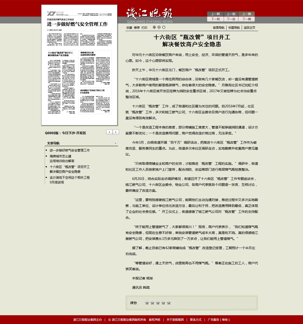“这里,要特别感谢钱江燃气公司,前期他们主动沟通对接,推进过程中又多次实地勘察,与施工单位、设计单位优化改造方法,最后让利于民,把改造费用降到最低,真正体现了企业的社会责任感。”开工仪式上,街道感谢了钱江燃气公司对“瓶改管”工作的支持配合。