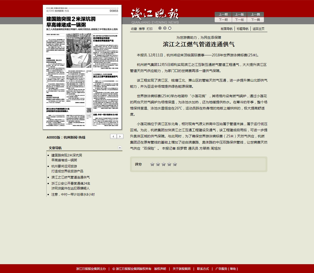 小莲花碗位于滨江区东北角,相对现有气源义桥高中压站属于管道末端,属于运行低压区域。为此,电竞博彩网 加快滨江之江互通工程建设及通气,该工程建成启用后,可进一步提升奥体区域的供气保障。与此同时,为了确保世界游泳锦标赛(25米)天然气供应,电竞博彩网 还在原有管线的基础上增加了经由滨康路、奥体路的中压双路保供管线,让世锦赛天然气供应“双保险”。 本报记者 段罗君 通讯员 方翠燕 周旭东