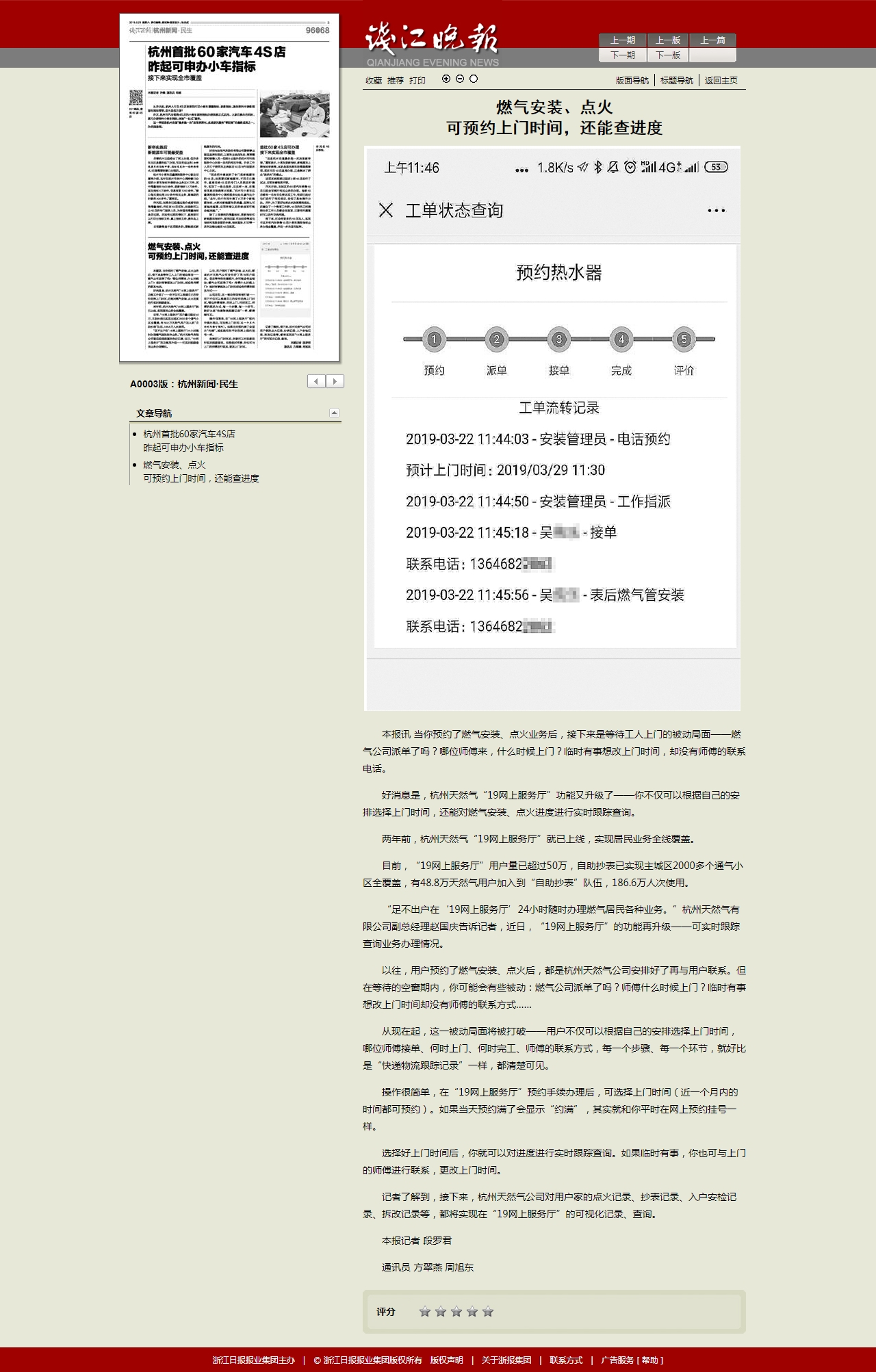 本报讯 当你预约了燃气安装、点火业务后,接下来是等待工人上门的被动局面——燃气公司派单了吗?哪位师傅来,什么时候上门?临时有事想改上门时间,却没有师傅的联系电话。