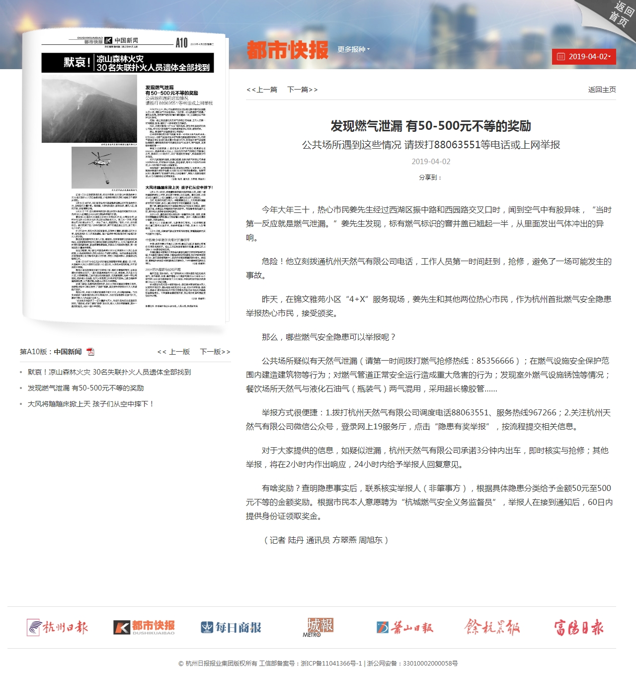 举报方式很便捷:1.拨打杭州天然气有限公司调度电话88063551、服务热线967266;2.关注杭州天然气有限公司微信公众号,登录网上19服务厅,点击“隐患有奖举报”,按流程提交相关信息。