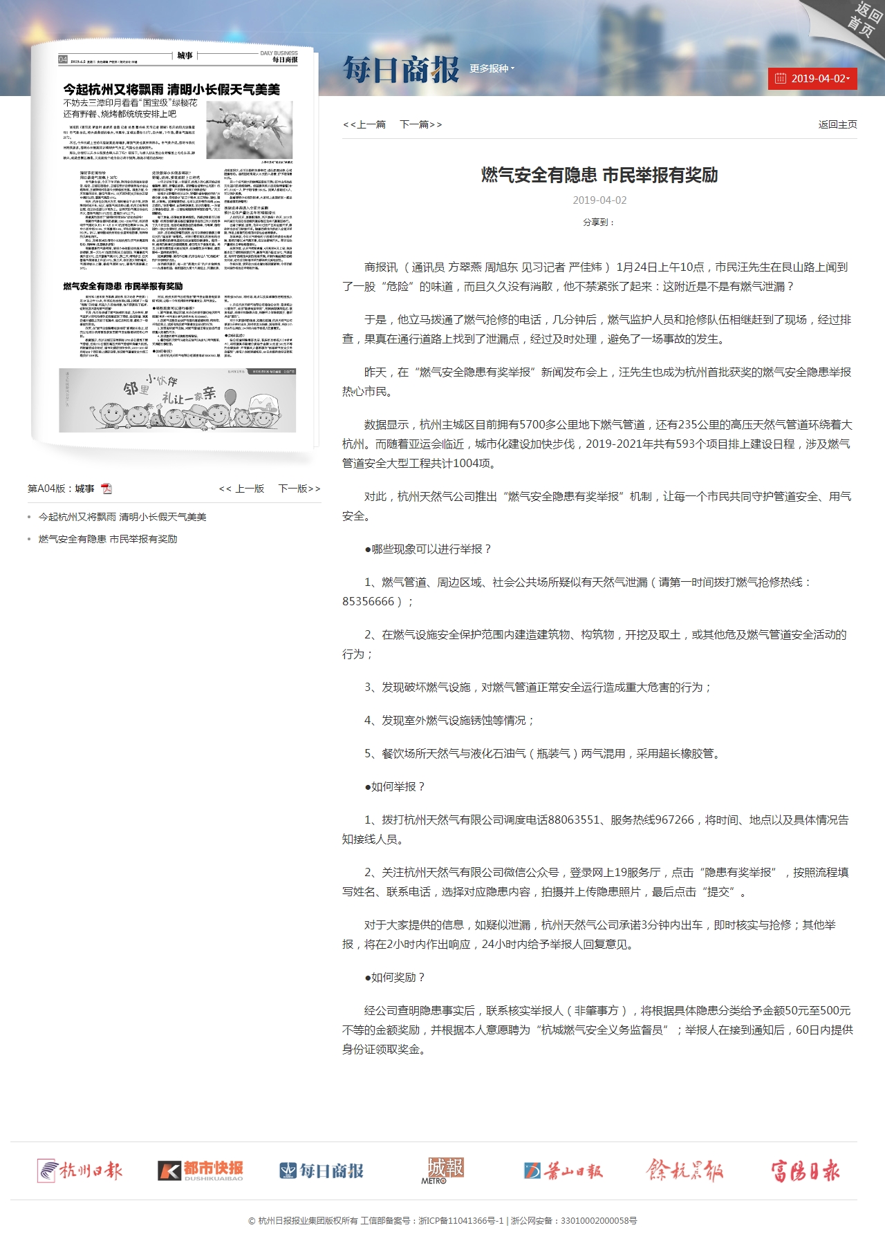 对于大家提供的信息,如疑似泄漏,杭州天然气公司承诺3分钟内出车,即时核实与抢修;其他举报,将在2小时内作出响应,24小时内给予举报人回复意见。