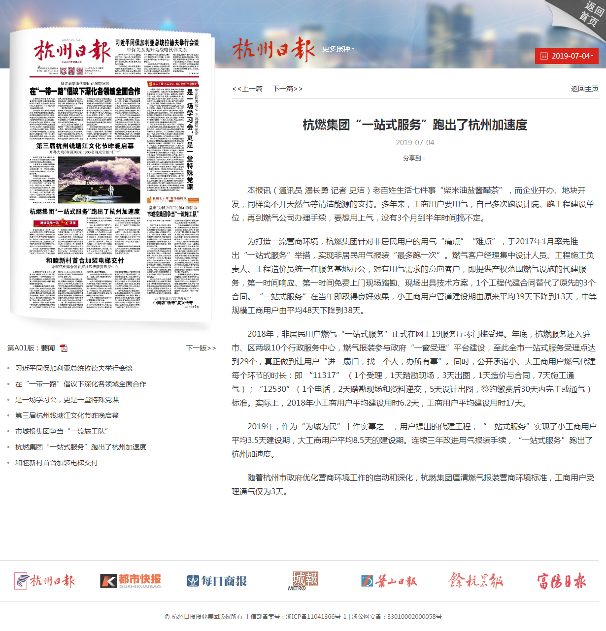 2019年,作为“为城为民”十件实事之一,用户提出的代建工程,“一站式服务”实现了小工商用户平均3.5天建设期,大工商用户平均8.5天的建设期。连续三年改进用气报装手续,“一站式服务”跑出了杭州加速度。