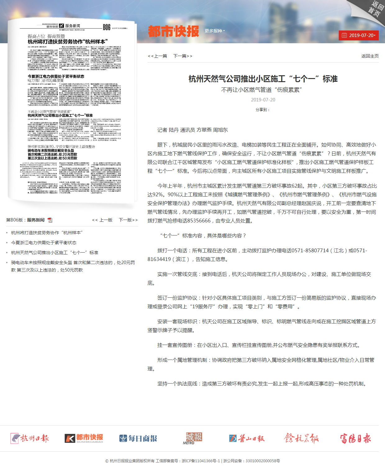 眼下,杭城居民小区里的雨污水改造、电梯加装等民生工程正在全面铺开。如何协同、高效地做好小区内施工地下燃气管线保护工作,确保安全运行,不让小区燃气管道“伤痕累累”?日前,杭州天然气有限公司联合江干区城管局发布“小区施工燃气管道保护标准化样板”, 推出小区施工燃气管道保护样板工程“七个一”标准。今后将以点带面,向主城区所有小区施工项目实施管线保护与文明施工样板推广。
