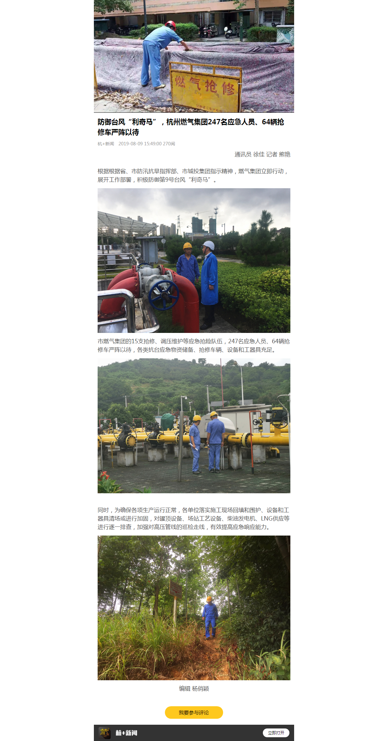 根据省、市防汛抗旱指挥部、市城投集团指示精神,燃气集团立即行动,展开工作部署,积极防御第9号台风“利奇马”。