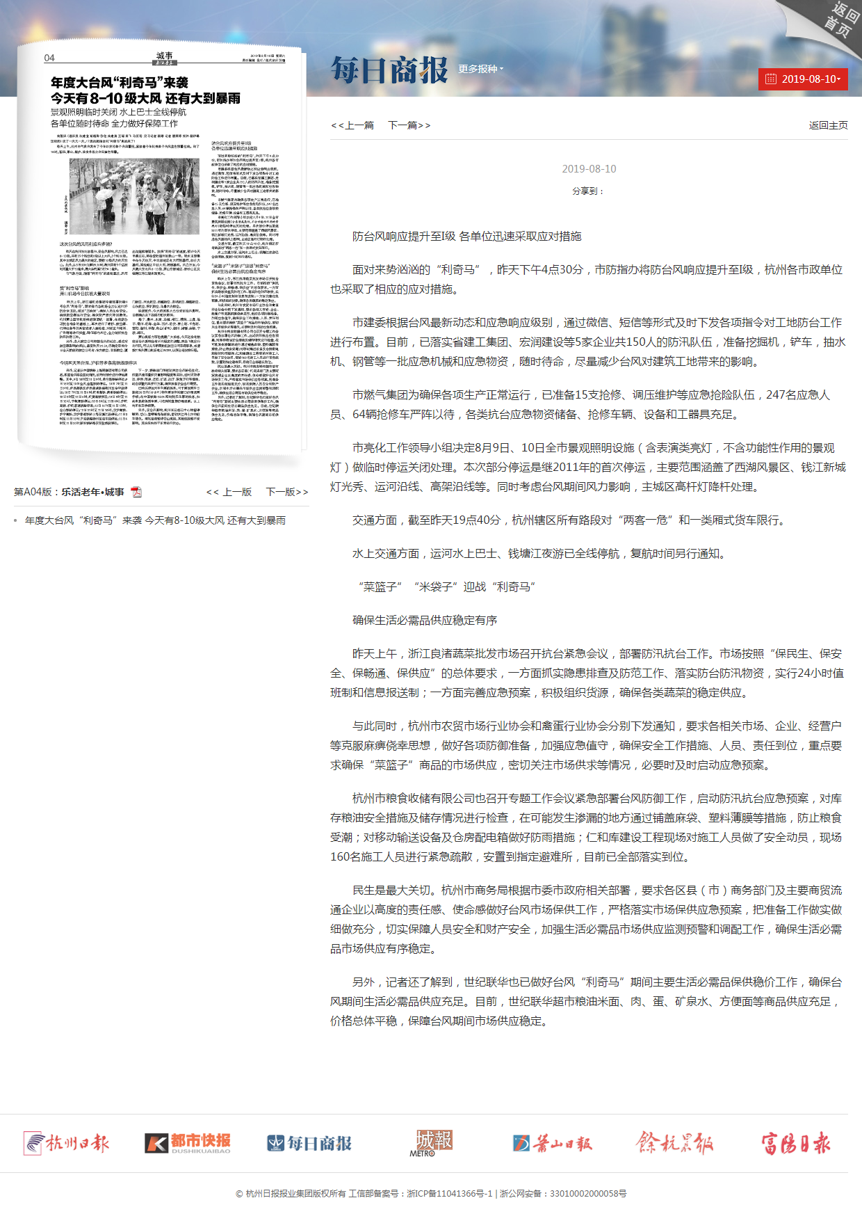 另外,记者还了解到,世纪联华也已做好台风“利奇马”期间主要生活必需品保供稳价工作,确保台风期间生活必需品供应充足。目前,世纪联华超市粮油米面、肉、蛋、矿泉水、方便面等商品供应充足,价格总体平稳,保障台风期间市场供应稳定。