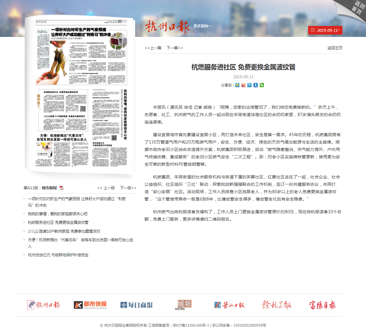 杭州燃气也给杭报读者发福利了,工作人员上门更换金属波纹管原价约80元,现在给杭报读者10个名额,免费上门服务,更多详情请扫二维码报名。