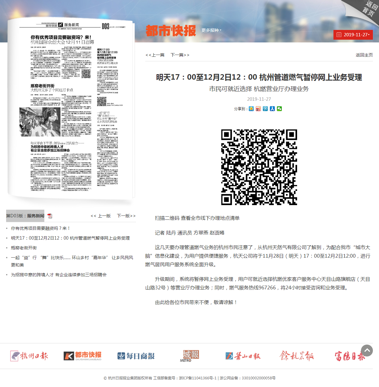 这几天要办理管道燃气业务的杭州市民注意了,从杭州天然气有限公司了解到,为配合我市“城市大脑”信息化建设,为用户提供便捷服务,杭天公司将于11月28日(明天)17:00至12月2日12:00,进行燃气居民用户服务系统全面升级。