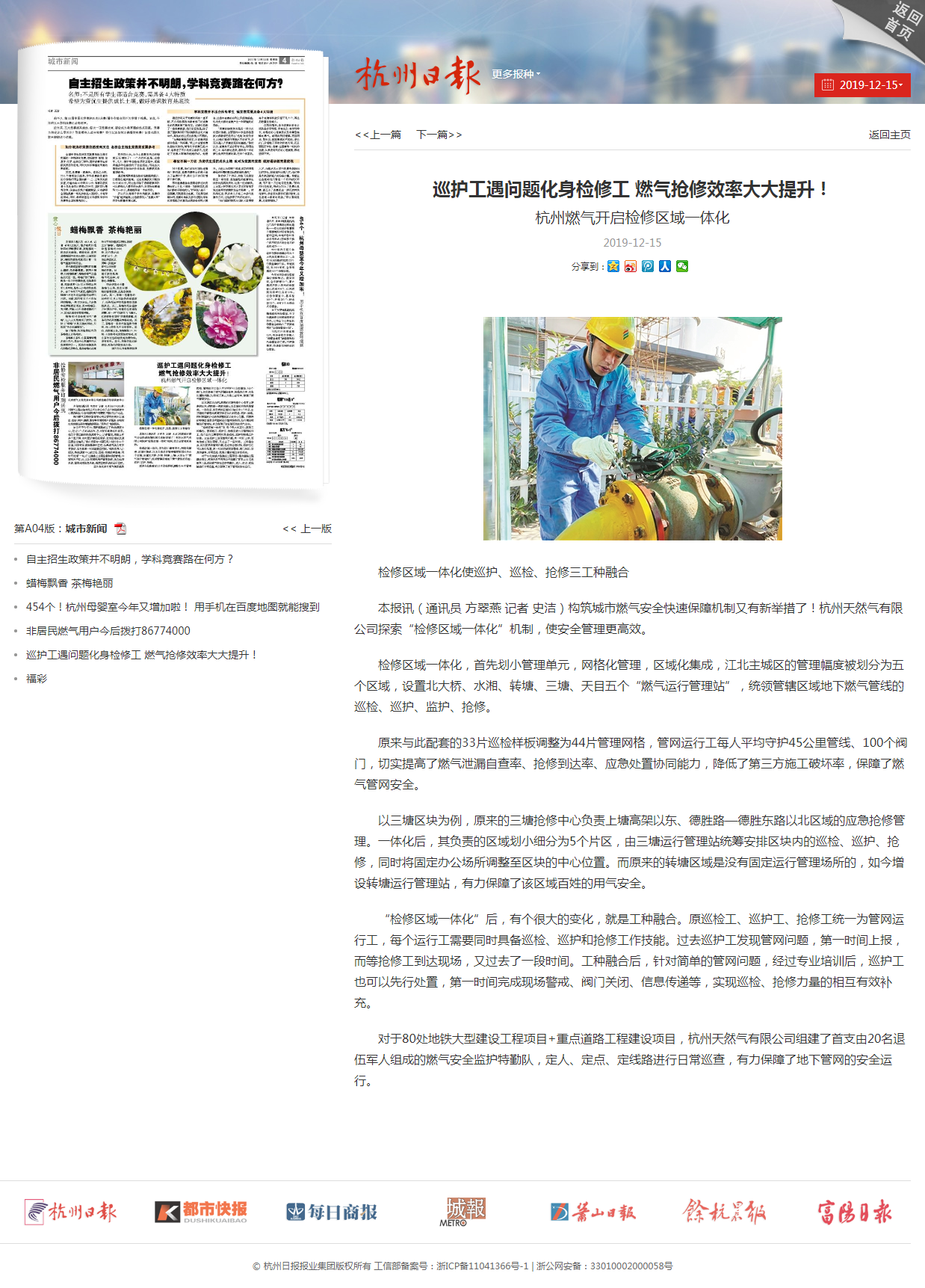 本报讯(通讯员 方翠燕 记者 史洁)构筑城市燃气安全快速保障机制又有新举措了!杭州天然气有限公司探索“检修区域一体化”机制,使安全管理更高效。
