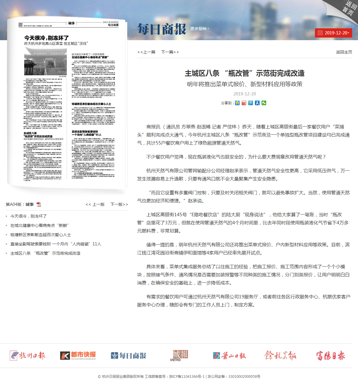 商报讯 (通讯员 方翠燕 赵语嫣 记者 严佳炜) 昨天,随着上城区高银街最后一家餐饮用户“菜捕头”顺利完成点火通气,今年杭州主城区八条“瓶改管”示范街及一个单独型瓶改管项目建设均已完成通气,共计55户餐饮商户用上了绿色能源管道天然气。