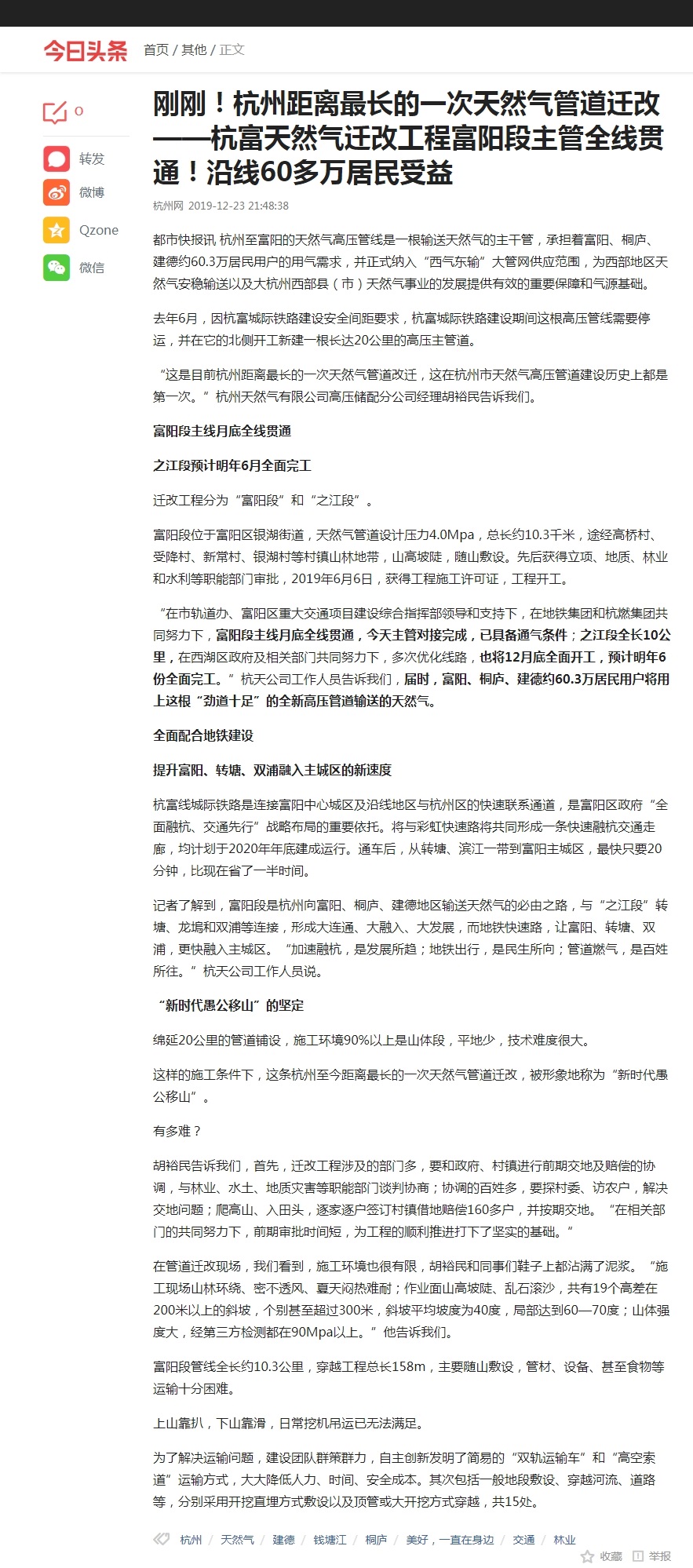 这样的施工条件下,这条杭州至今距离最长的一次天然气管道迁改,被形象地称为“新时代愚公移山”。