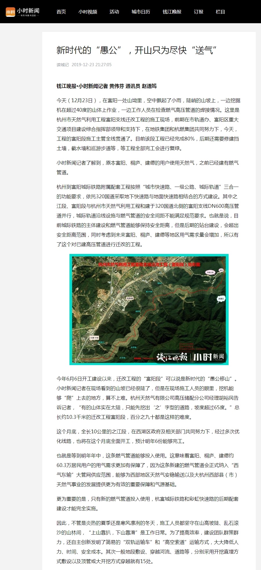 今年6月6日开工建设以来,迁改工程的“富阳段”可以说是新时代的“愚公移山”。小时新闻记者在现场看到的山坡已经很陡了,但是在现场施工人员的眼里,挖机能够“爬”上去的地方,算不上难。杭州天然气有限公司高压储配分公司经理胡裕民告诉记者,“有的山体实在太陡,只能先挖出‘之’字型的道路,坡度超过65度。”总长约10.3千米的迁改工程富阳段,百分之九十都是这样的难度。