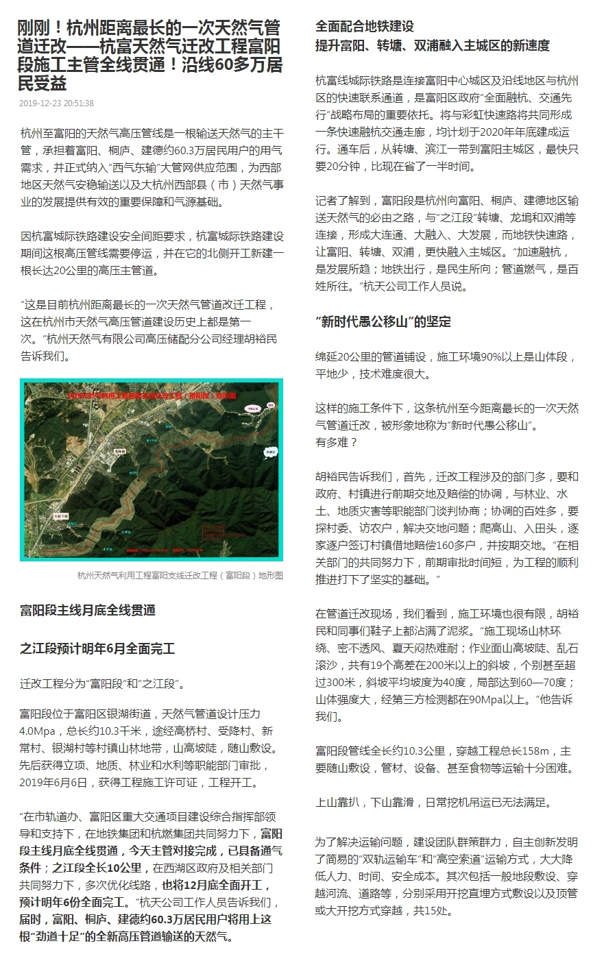 这样的施工条件下,这条杭州至今距离最长的一次天然气管道迁改,被形象地称为“新时代愚公移山”。