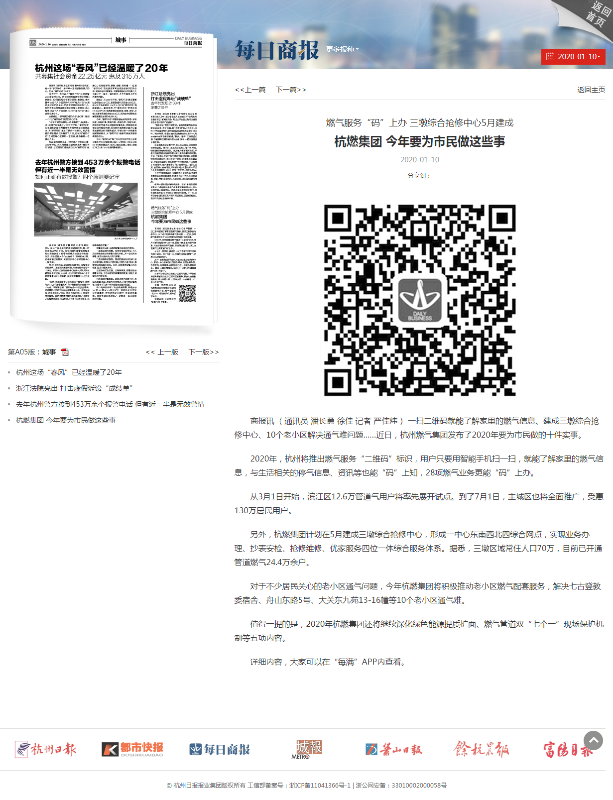 商报讯 (通讯员 潘长勇 徐佳 记者 严佳炜) 一扫二维码就能了解家里的燃气信息、建成三墩综合抢修中心、10个老小区解决通气难问题……近日,杭州燃气集团发布了2020年要为市民做的十件实事。