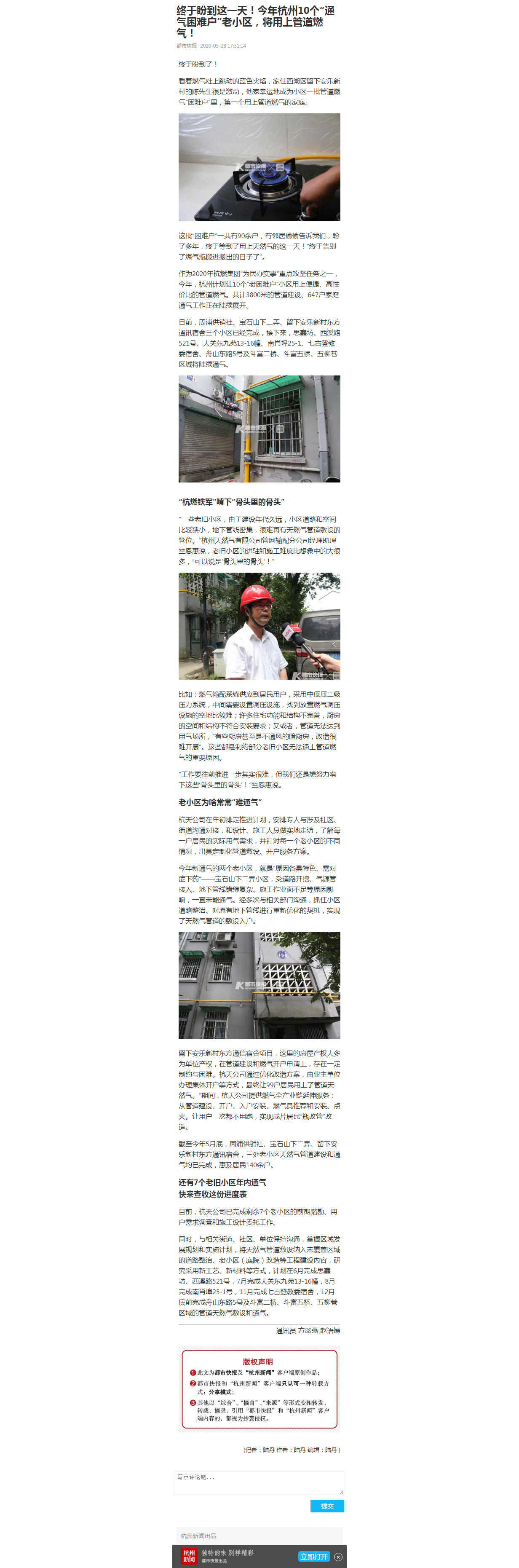 作为2020年电竞博彩网 “为民办实事”重点攻坚任务之一,今年,杭州计划让10个“老困难户”小区用上便捷、高性价比的管道燃气。共计3800米的管道建设、647户家庭通气工作正在陆续展开。