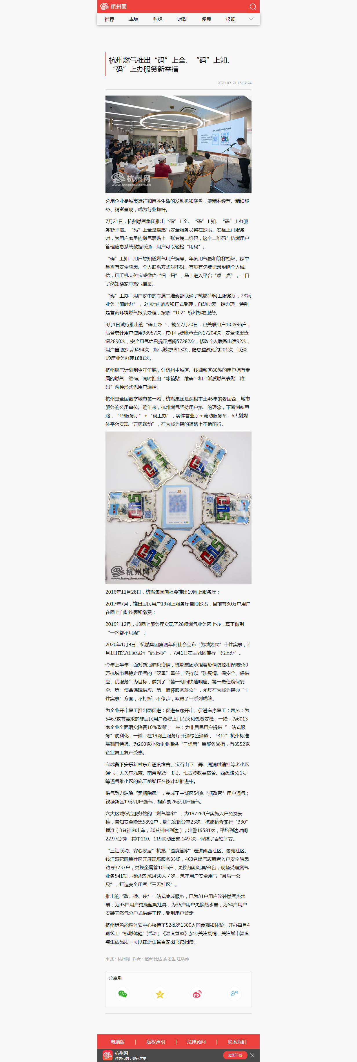 “码”上办:用户家中的专属二维码都联通了杭燃19网上服务厅,28项业务“即时办”, 2小时内响应和正式受理,自助抄表一键办理;特别是营商环境燃气报装办理,按照“102”杭州标准服务。