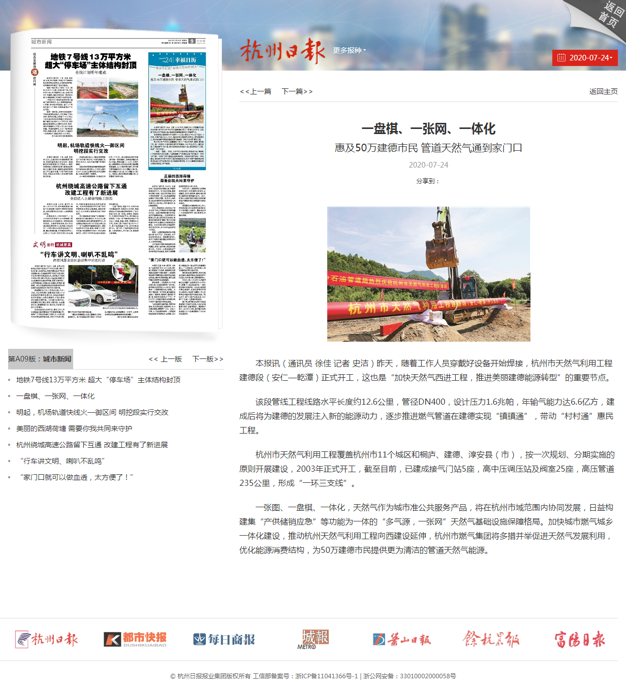 一张图、一盘棋、一体化,天然气作为城市准公共服务产品,将在杭州市域范围内协同发展,日益构建集“产供储销应急”等功能为一体的“多气源,一张网”天然气基础设施保障格局。加快城市燃气城乡一体化建设,推动杭州天然气利用工程向西建设延伸,杭州市燃气集团将多措并举促进天然气发展利用,优化能源消费结构,为50万建德市民提供更为清洁的管道天然气能源。