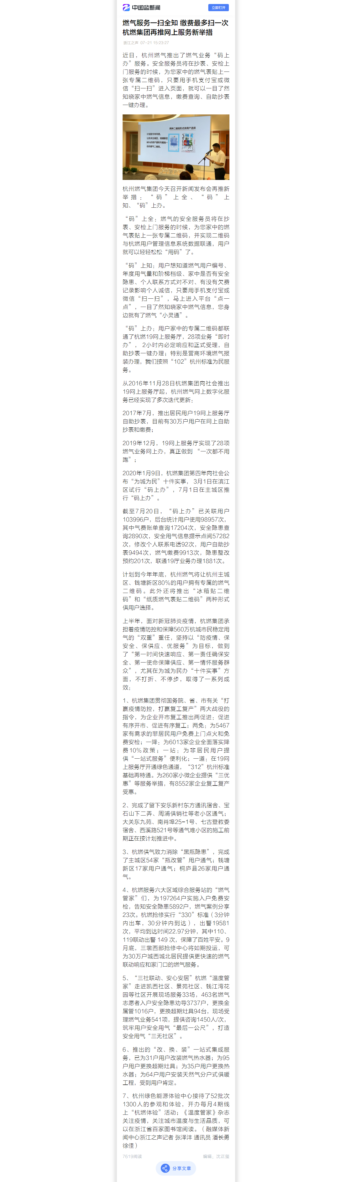 7、杭州绿色能源体验中心接待了52批次1300人的参观和体验,开办每月4期线上“杭燃体验”活动;《温度管家》杂志关注疫情,关注城市温度与生活品质,可以在浙江省百家图书馆阅读。