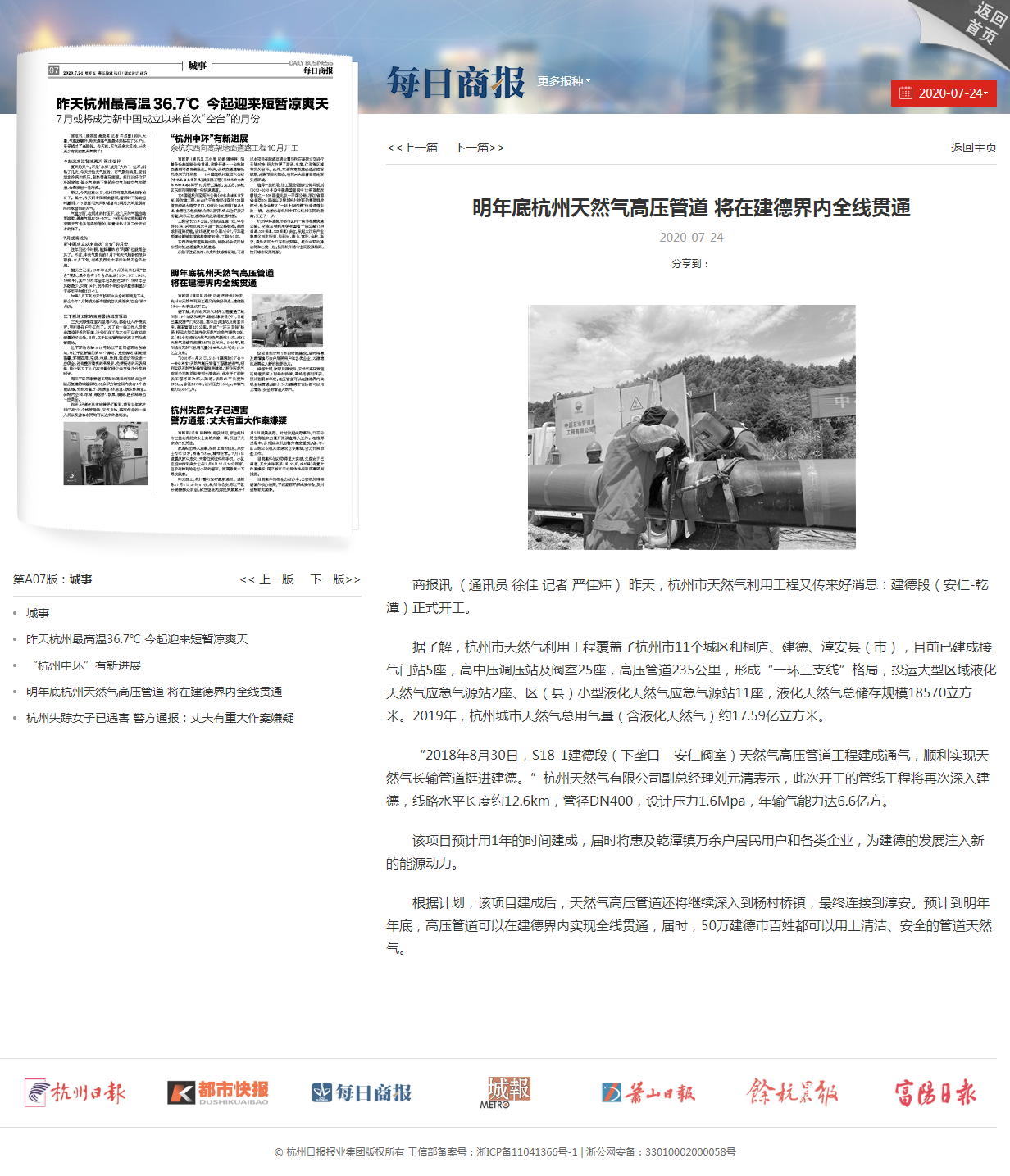 商报讯 (通讯员 徐佳 记者 严佳炜) 昨天,杭州市天然气利用工程又传来好消息:建德段(安仁-乾潭)正式开工。
