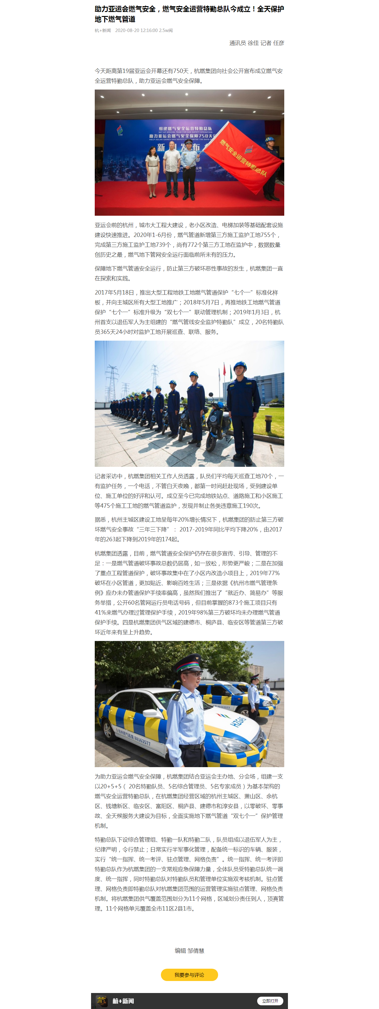 为助力亚运会燃气安全保障,电竞博彩网 结合亚运会主办地、分会场,组建一支以20+5+5( 20名特勤队员、5名综合管理员、5名专家成员)为基本架构的燃气安全运营特勤总队,在电竞博彩网 经营区域的杭州主城区、萧山区、余杭区、钱塘新区、临安区、富阳区、桐庐县、建德市和淳安县,以零破坏、零事故、全天候服务大建设为目标,全面实施地下燃气管道“双七个一”保护管理机制。