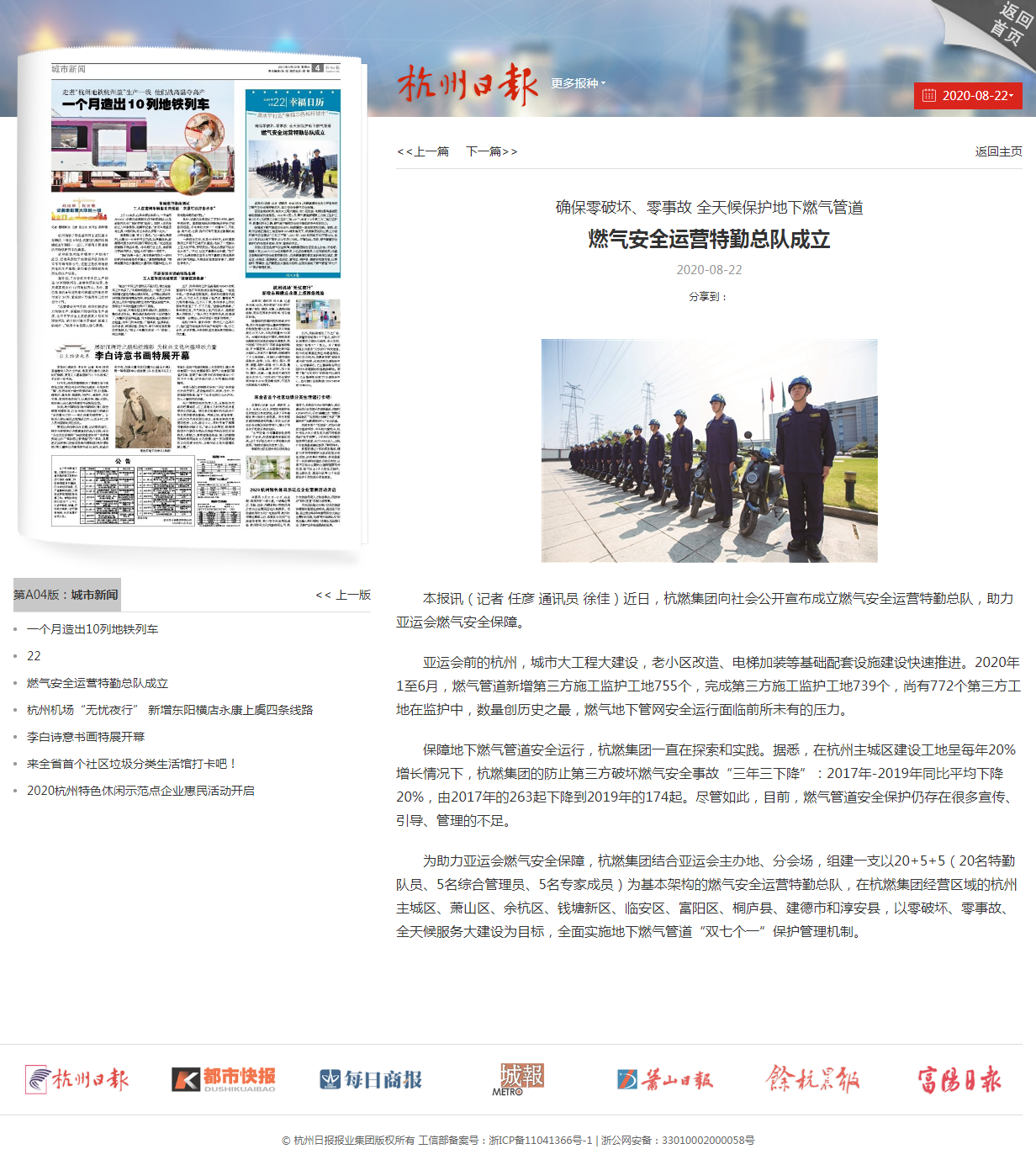 为助力亚运会燃气安全保障,电竞博彩网 结合亚运会主办地、分会场,组建一支以20+5+5(20名特勤队员、5名综合管理员、5名专家成员)为基本架构的燃气安全运营特勤总队,在电竞博彩网 经营区域的杭州主城区、萧山区、余杭区、钱塘新区、临安区、富阳区、桐庐县、建德市和淳安县,以零破坏、零事故、全天候服务大建设为目标,全面实施地下燃气管道“双七个一”保护管理机制。