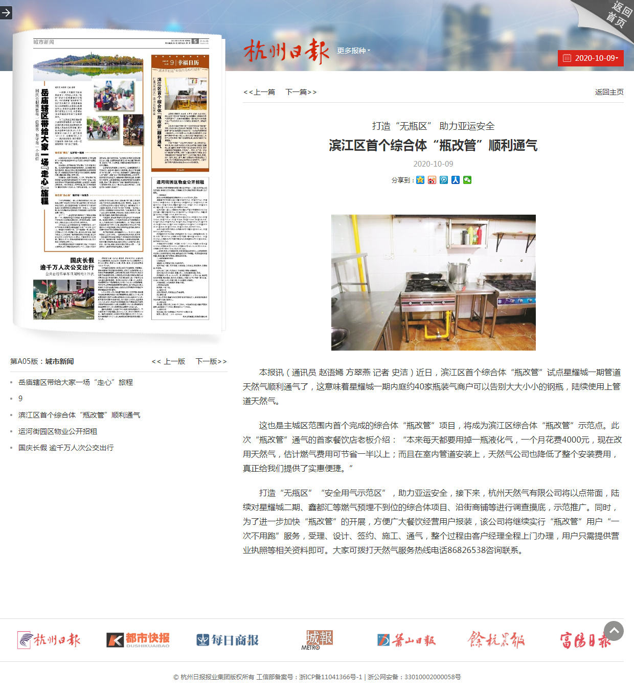 打造“无甁区”“安全用气示范区”,助力亚运安全,接下来,杭州天然气有限公司将以点带面,陆续对星耀城二期、鑫都汇等燃气预埋不到位的综合体项目、沿街商铺等进行调查摸底,示范推广。同时,为了进一步加快“瓶改管”的开展,方便广大餐饮经营用户报装,该公司将继续实行“瓶改管”用户“一次不用跑”服务,受理、设计、签约、施工、通气,整个过程由客户经理全程上门办理,用户只需提供营业执照等相关资料即可。大家可拨打天然气服务热线电话86826538咨询联系。