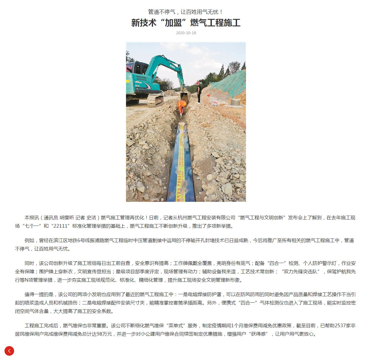 燃气施工管理再优化!日前,记者从杭州燃气工程安装有限公司“燃气工程与文明创新”发布会上了解到,在去年施工现场“七个一”和“22111”标准化管理举措的基础上,燃气工程施工不断创新升级,推出了多项新举措。