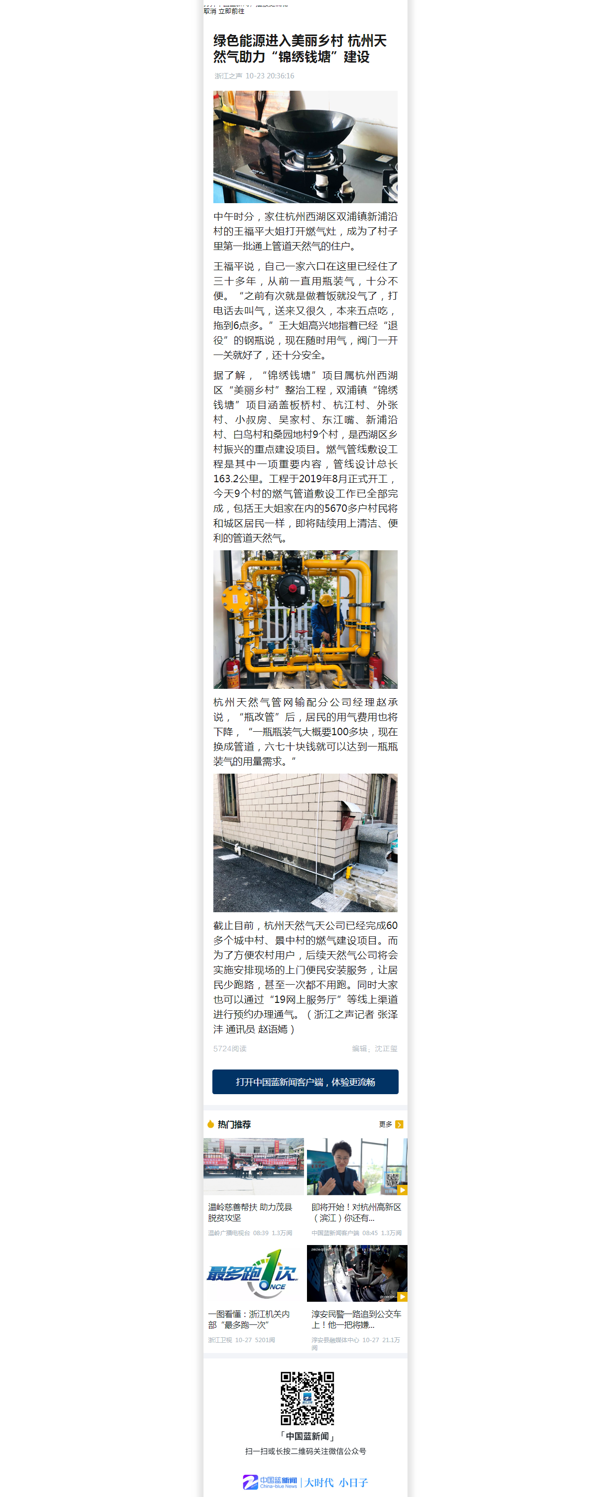 中午时分,家住杭州西湖区双浦镇新浦沿村的王福平大姐打开燃气灶,成为了村子里第一批通上管道天然气的住户。