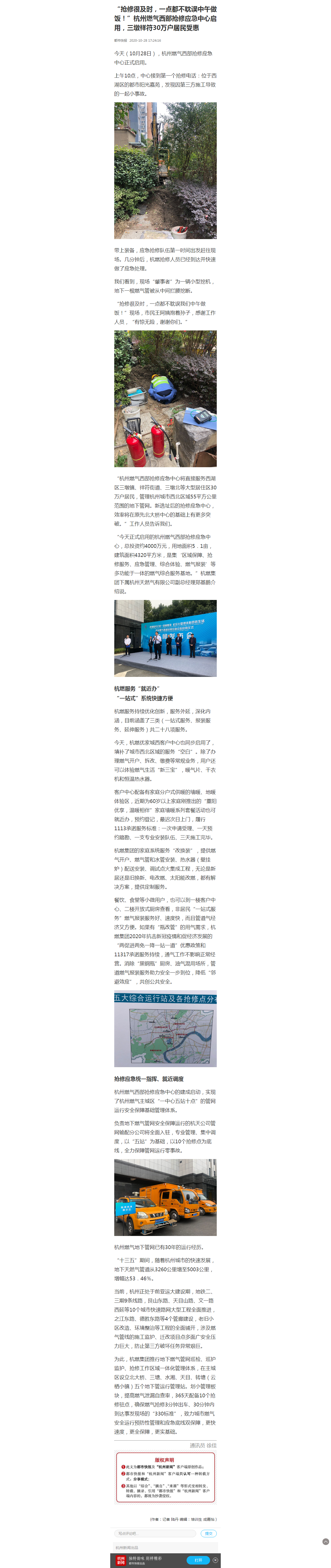 带上装备,应急抢修队伍第一时间出发赶往现场。几分钟后,杭燃抢修人员已经到达并快速做了应急处理。